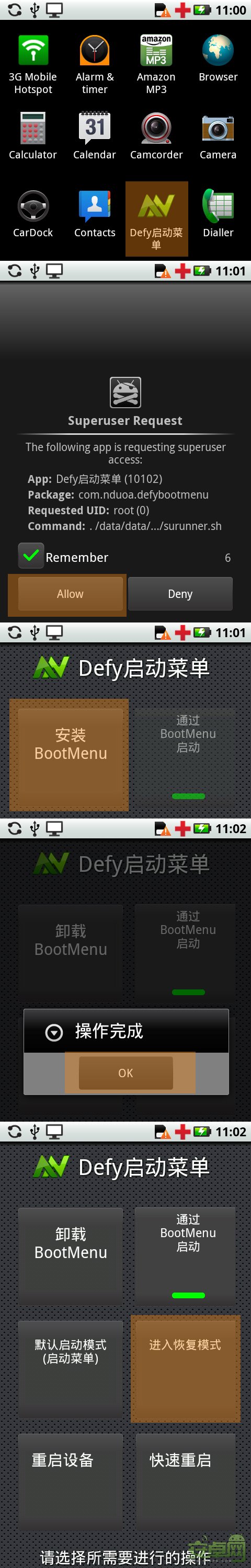 進入程序選擇Defy啟動菜單,期間會出現兩次提示,選擇允許Allow,點擊安裝BootMenu;安裝完成之後點擊OK;之後點擊進入恢復模式;手機會重啟至恢復模式,如圖。