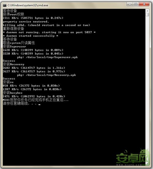 打開桌面刷機工具包OneClickRoot+Recovery目錄下root.bat,等待完成後手機會自動重啟。#p#副標題#e#