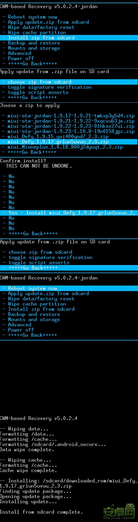 使用Recovery將MIUI ROM刷入手機!確保手機已經進入Recovery菜單。手動進入方法,開機亮藍燈的瞬間按音量下鍵進入。