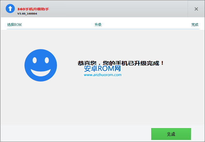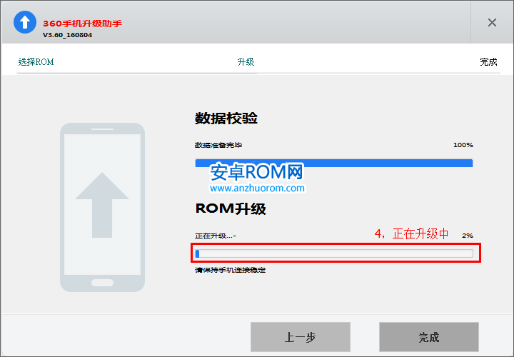 6、刷機工具顯示”正在升級,請保持於手機連接穩定“,直到刷機工具顯示”恭喜您,您的手機已升級完成“(由於刷機等同於重新做系統,所以刷機過程和刷機完成後首次開機時間較長,請耐心等待。);