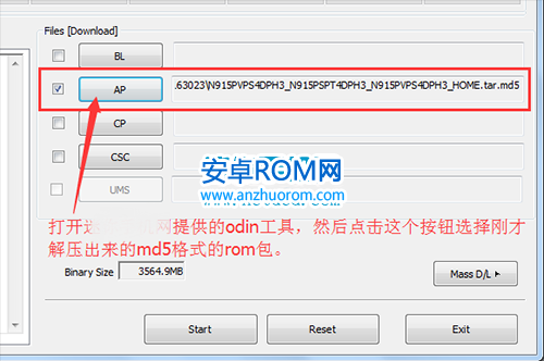 4:打開odin軟件之後軟件會自動識別你的手機,識別成功後會在ID:COM處顯示藍色的(表示手機連接成功了,如果沒有顯示藍色的,說明沒有有連接好),然後勾選AP,選取之前下載並解壓出來的md5格式的文件包。