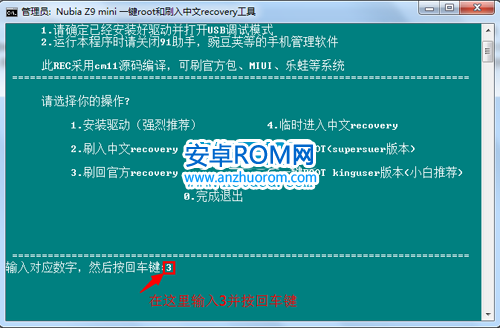 1:在手機裡打開usb調試模式,檢查一下手機有沒有用數據線連接好電腦,保證手機能和電腦正常連接,然後把之前下載下來的recovery工具包在電腦上進行,解壓出來一個文件夾,然後在解壓出來的文件夾裡找到exe格式的文件直接雙擊打開運行,然後輸入3並按回車鍵自動開始刷入