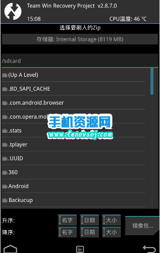 1:先將之前下載好的ROM卡刷包復制到手機的SD卡的根目錄下,然後手機開始進入recovery界面:進入方法:先把手機關機,然後手機在關機的狀態下同時按住 音量增加鍵 和 電源鍵 不要松,數秒後即可進入中文TWRP就可以了。
