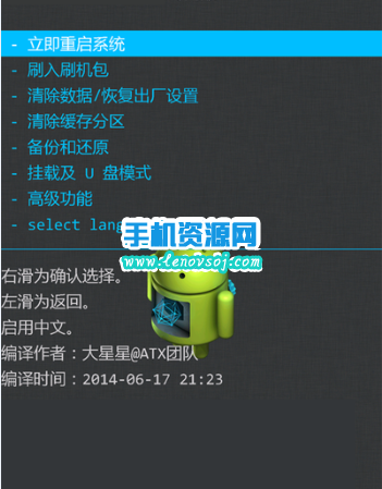 1:先將之前下載好的ROM卡刷包復制到手機的SD卡的根目錄下,進入刷好的recovery中 (進入的方法:先把手機關機,然後手機在關機的狀態下同時按住手機的 音量上鍵 + 開機鍵 (兩鍵同時按住)數秒即可進入recovery界面,會提示選取語言)