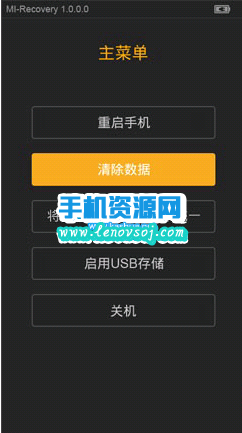3:選取簡體中文並確認,在recovery界面裡 音量鍵表示選取 電源鍵表示確認,我們用用音量鍵選取第二個,清除數據,按一下電源鍵確認進入,然後用音量鍵選取上方三個清空的選項,這就是三清,按電源鍵確認,依次清除。