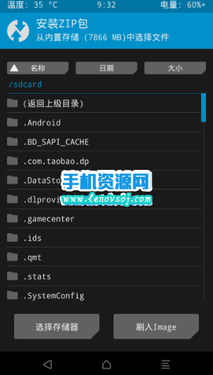 4:雙清完成後選取刷機包刷機:選取【安裝】進入下級頁面,然後找到下載你放在SD卡的zip格式的刷機包選取它,提示:選取存儲器按鈕可以實現內置存儲、外置TF卡的切換,根據你自己的rom包放的位置來選取。