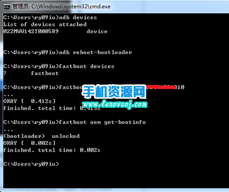6:我們可以查看下是否已經成功解鎖,輸入 fastboot oem get-bootinfo ,回車,將會看到如下輸出結果,狀態為unlocked 即為解鎖成功
