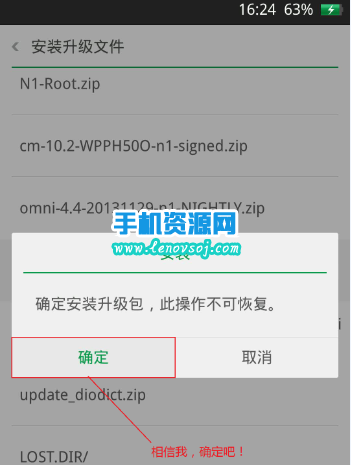 5:接下來選擇剛才復制到手機存儲卡根目錄下的zip格式的升級包,然後選擇確定,接著就開始安裝啦