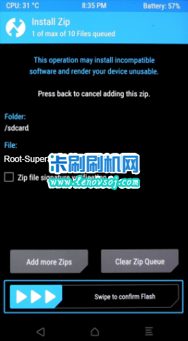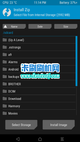 3:在recovery主界面,點擊 “Install”,即可進入系統目錄選擇文件。選擇“select stroage”可以切換內外存儲器,找到剛剛准備好的zip格式root包,點擊它,然後滑動下方按鈕滑動確認刷入。