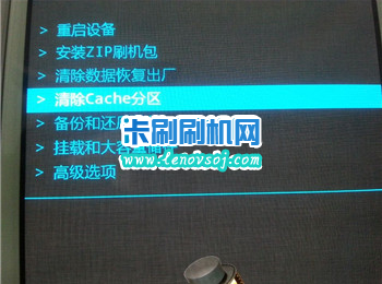 4:返回到recovery主界面,然後用音量鍵選取【清空Cache分區】,然後再選取【是的-清空Cache】然後按電源鍵確認