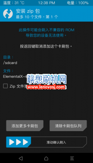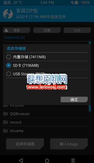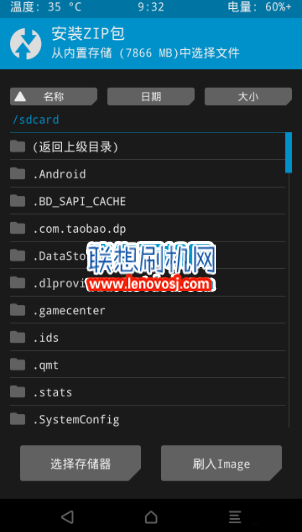 5:清理完成之後返回到recovery主界面,點擊 “安裝”,即可進入系統目錄選擇文件。選擇“選擇存儲器”可以切換內外存儲器,找到剛剛准備好的zip格式rom包,點擊它,然後滑動下方按鈕“滑動確認刷入。