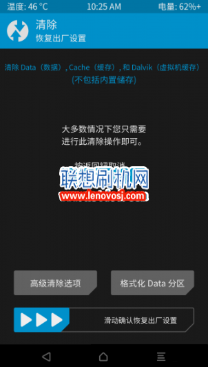 4:刷入ROM之前建議清空用戶數據,即清空data分區下的文件(所以,請實先務必做好重要數據備份工作,比如聯系人、短信、已安裝軟件等,內置 存儲中的文件將不會被清除),相當於恢復出廠設置,操作方法是:點擊 “清除”,滑動下方的按鈕 “滑動按鈕開始執行”,很快就完成了該操作,一直點右下角返回箭頭,即可返回 Recovery 主界面。