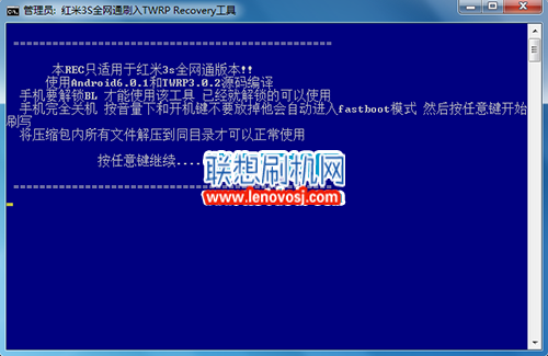 2:然後把上面下載下來的recovery工具包在電腦上進行解壓,解壓出來一個文件夾,然後在文件夾裡找到【刷入第三方TWRPrecovery.bat】文件直接雙擊打開,然後根據提示直接按回車鍵即可。