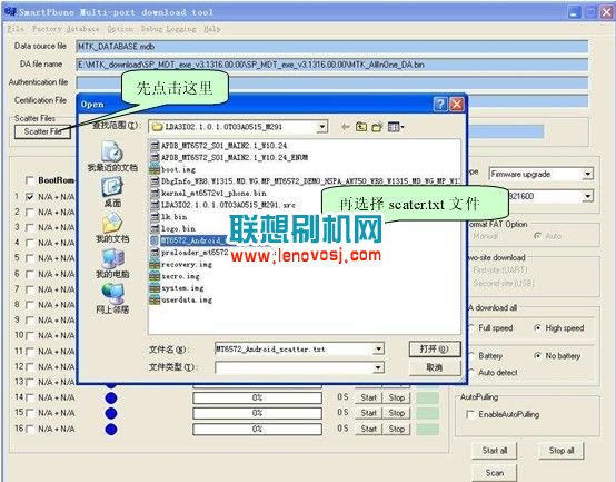 1、將解壓好的升級工具打開,運行其中的'SPMultiPortFlashDownloadProject.exe",運行後先點擊scatter File,選擇手機升級軟件包裡的scatter文件(MT6582_Android_scatter.txt)如