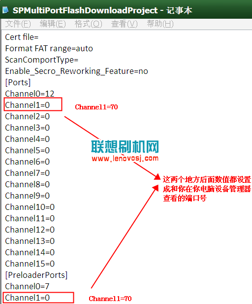 3、找到了端口號之後,就拔掉數據線,手機暫且不用管它,再進入線刷刷機工具的目錄,注意這裡我們先不運行此工具文件夾中的“SPMultiPortFlashDownloadProject.ini”文件。找到[PreloaderPorts]這一項,把PreLoader 端口號設置到 Channel1=70,當然如果您在您的電腦設備管理器中查看到的是50,也就是設置成Channel10=50了,怕大家不明白,我做了一個圖,如下: