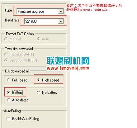 5、在工具中設置升級方式(工具右側),請先將Type設置為Firmware upgrade;Baud rate設置為:921600,下載下speed建議選擇High speed方式,再選Battery下載方式。如下所示: