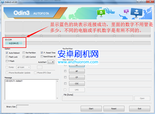 4:打開odin軟件之後軟件會自動識別你的手機,識別成功後會在ID:COM處顯示藍色的(表示手機連接成功了,如果沒有顯示藍色的,說明沒有有連接好),然後勾選AP,選擇上面下載並解壓出來的md5格式的文件包。
