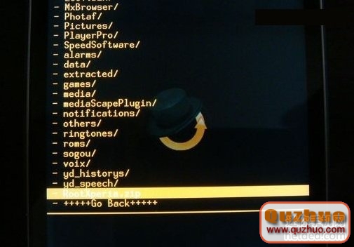 5:按音量小鍵,定位菜單到“choose zip from sdcard”,按相機鍵,進入下一層菜單。