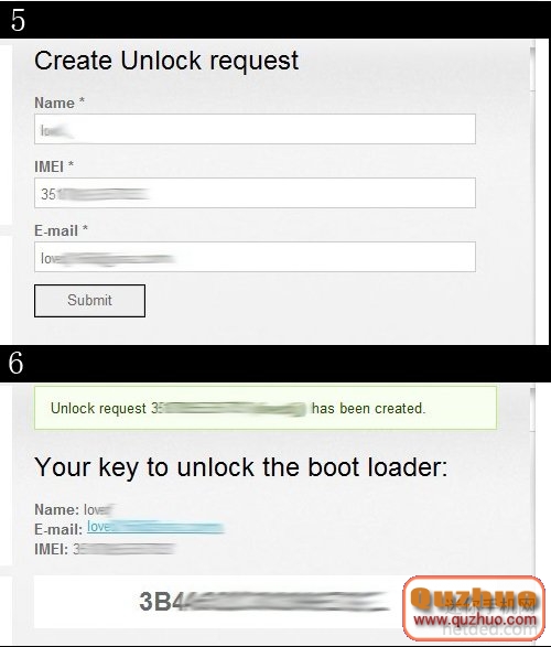 4:在下面的框中輸入你的名字,IMEI號的前14位和你的Email,然後點擊“Submit”,就可以看到索尼官方供給的解鎖碼了。
