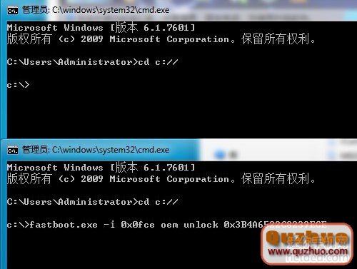 7:在DOS窗口下輸入cd c://回車(cd和c://直接有一個空格),然後輸入輸入fastboot.exe -i 0x0fce oem unlock 0x.......KEY,(......KEY代表得到的解鎖碼)回車等候解鎖完結。(請留意空格,0和o的差異)