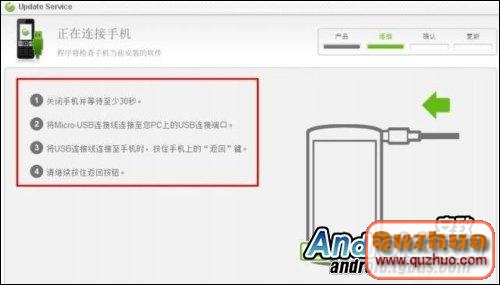 4、按照如圖紅框中的提示進行操作(有的機油在這裡可能看不明白,我用我的話描述一遍:簡單的說就是先按住返回鍵不用松開,然後用數據線連接手機與www.shuleba.com電腦,仍然不要松開)