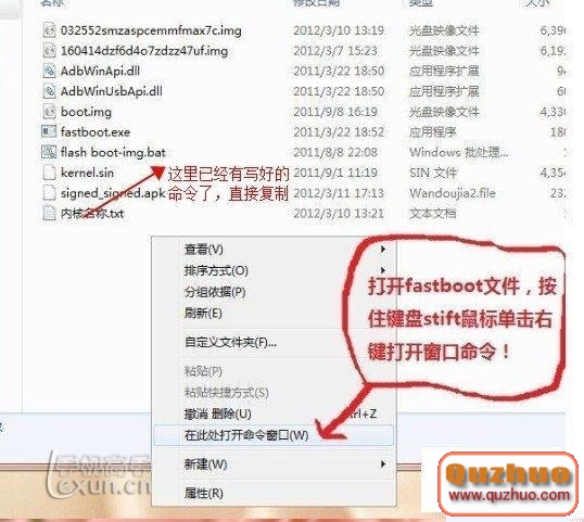 1:進入到剛才打開的fastboot文件夾,然後在文件裡的空白處先按住鍵盤上的shift鍵不要松,然後用鼠標在空白處點擊右鍵選擇“在此處打處命令窗口”(注意:如果你的www.shuleba.com電腦是xp系統的話需要打開-開始-運行,然後輸入cmd 按回車即可)