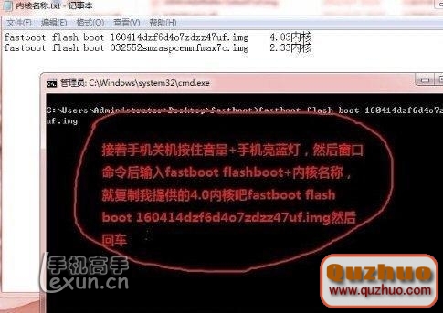 2:然後手機關機,按住音量+連接usb,連接正常,藍燈會亮,然後在剛才打開的黑色的窗口命令裡輸入:fastboot flash boot 160414dzf6d4o7zdzz47uf.img 然後按回車,(注意,這個命令比較長,我在文本文檔裡已經寫好了,直接復制到那個命令窗口裡就可以了)