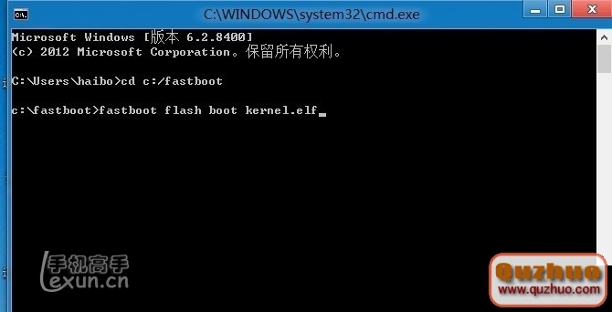 然後找到你剛才解壓的fastboot 文件夾。右鍵,用命令打開。這時你可以看到一個DOS窗口。然後鍵入:fastboot flash boot kernel.elf 然後按回車。