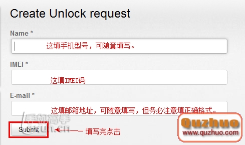 7、name處輸入手機型號,可隨意填寫; IMEI處輸入你手機的IMEI號碼(注:只輸入前14位 ) ; email處輸入郵箱地址,可隨意填寫,但格式務必正確。 點擊 Sbmit