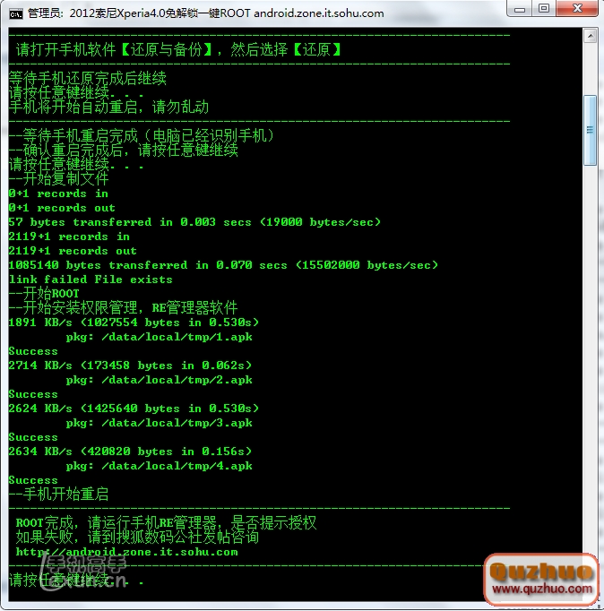 4.等待手機還原完成後,依照ROOT軟件的提示,繼續按任意鍵下一步,手機開始重啟
