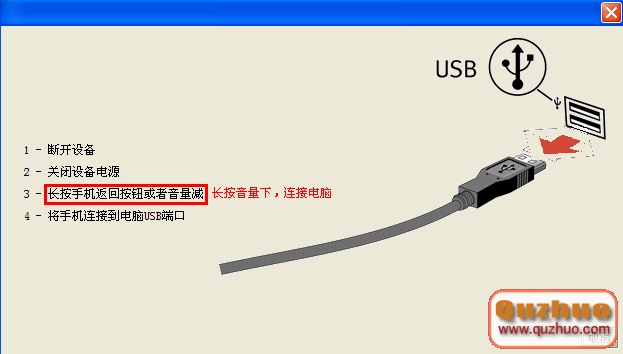 手機關機--按住手機音量下鍵--使用數據線連接 電腦