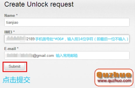 新頁面填寫手機串號、郵箱,點擊“submit”
