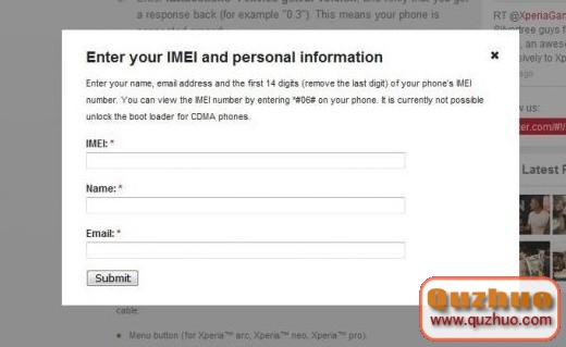 5、輸入你手機的IMEI號碼(IMEI碼輸入前十四位)、姓名、郵箱地址,點擊“Sbmit”
