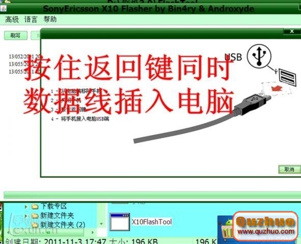 這時手機在關機的狀態下按住手機的返回鍵同時用數據線插入到你