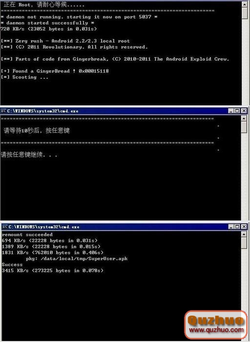 PS:中間有個等待10秒,因為這一步會斷開手機連接然後重新連,所以最好能多等一會兒,確保重新連接成功,也可以看著計算機的設備管理器,等 Android ADB Interface 出現了再按任意鍵繼續。建議先把TF卡格式化一下再進行ROOT,因為TF卡中如果有很多東西,可能會導致斷開後再連接需要很長時間。干淨的TF卡就很快,5秒就夠了。