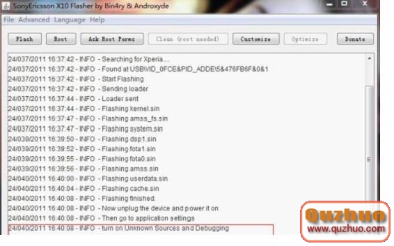 到 turn on Unknown Sources and Debugging這段英文,表示強刷成功,可以斷開數據線開機了