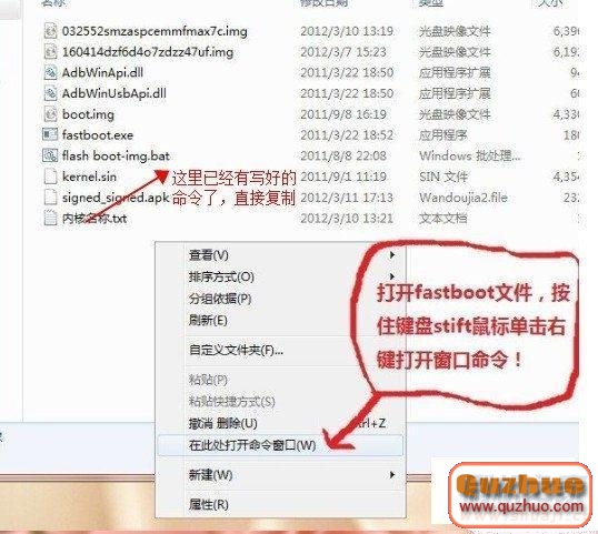 1:進入到剛才打開的fastboot文件夾,然後在文件裡的空白處先按住鍵盤上的shift鍵不要松,然後用鼠標在空白處點擊右鍵選擇“在此處打處命令窗口”(注意:如果你的 電腦是xp系統的話需要打開-開始-運行,然後輸入cmd 按回車即可)