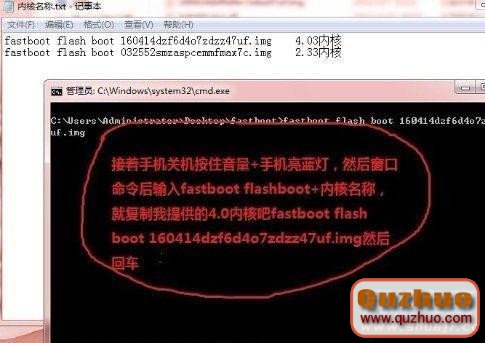 2:然後手機關機,按住音量+連接usb,連接正常,藍燈會亮,然後在剛才打開的黑色的窗口命令裡輸入:fastboot flash boot 160414dzf6d4o7zdzz47uf.img 然後按回車,(注意,這個命令比較長,我在文本文檔裡已經寫好了,直接復制到那個命令窗口裡就可以了)