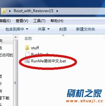 3:解壓上面下載好的root工具包,打開Root_with_Restorev15文件夾,雙擊運行裡面的“RunMe簡體中文.bat ”文件
