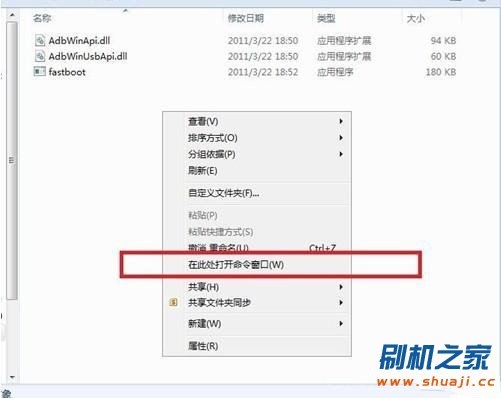 9、按住鍵盤“Shift”鍵,在fastboot 文件夾中點擊鼠標右鍵,彈出菜單,選擇“在此處打開命令窗口”——DOS窗口(XP系統操作方法為:在運行中打開窗口輸入cmd,進入命令後輸入