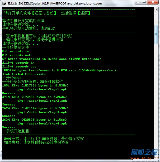 4.等待手機還原完成後,依照ROOT軟件的提示,繼續按任意鍵下一步,手機開始重啟