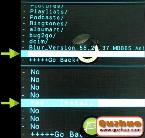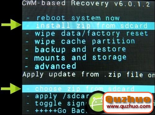 3:進入recovery之後,按手機的音量鍵選擇install zip from sdcard,然後再選擇choose zip from sdcard,然後找到剛才放到手機sd卡裡zip格式的root包 XXXX.zip,然後按音量鍵選中,然後按開機鍵確認,接著選中 Yes-install XXXXX.zip並確認開始刷機...