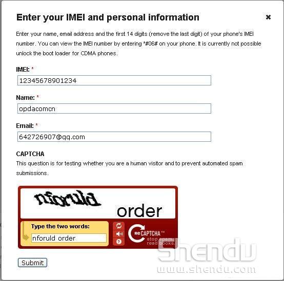 3、請輸入IMEL前14位,自己姓名和自己郵箱,最後輸入驗證碼。點擊Submit後,得到解鎖碼,請復制保存好。