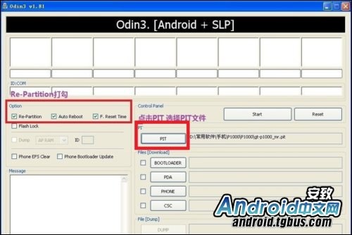 2. 選擇Option下的“Re-Partition”, “Auto Reboot” 和“F. Reset Time”,然後點擊“PIT”選擇gt-p1000_mr.pit