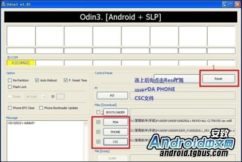5. PIT文件升級完成後手機將自動開機,斷開數據線,關機重新進入升級模式,重新與電腦連接,點擊Reset選項,選擇Option下的Auto Reboot 和F. Reset Time(不要選擇Re-Partition)然後選擇升級文件,具體如下:(不要選擇PIT文件)