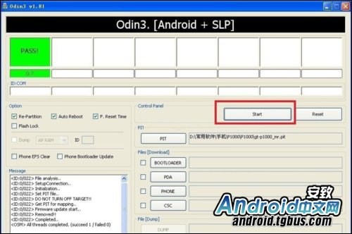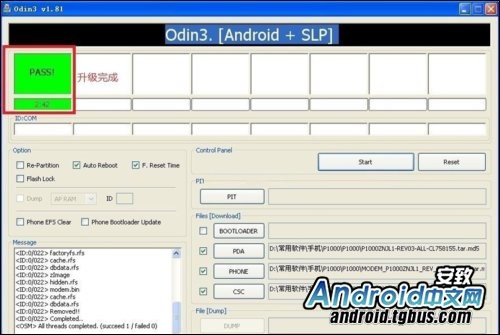 4. 手機通過數據線與電腦連接,確認端口被識別後,點擊Start選項,開始升級PIT文件,PIT文件升級完成界面如下: