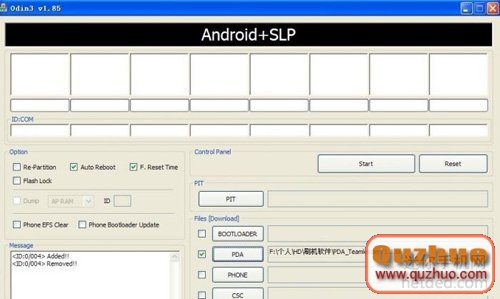 6:然後翻開Odin3 v1.85.exe,挑選PDA為解壓出來的PDA_TeamleaderV1.3.tar。(其他的對照下圖,不需要改動什麼東西)