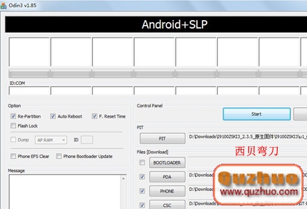 2:www.shuleba.com電腦上翻開刷機軟件Odin3,點擊軟件界面相應按鈕,從www.shuleba.com電腦中挑選相應文件(請一一對應,不要挑選錯了),以刷I9100ZSKI3_2.3.5固件為例。留意,不一樣的刷機包,下面的稱號能夠有所不一樣,不過只需是Odin3辦法刷的,基本上都包含下面這幾個文件。