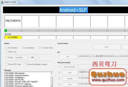5:手機被Odin3刷機軟件識別後,軟件界面左上角的ID:COM窗口和左下角的message窗口會有提示。