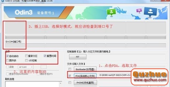 2、點擊軟件內的PDA,把下載的cofface_samsungI9500_recovery_cn_0503.tar選上